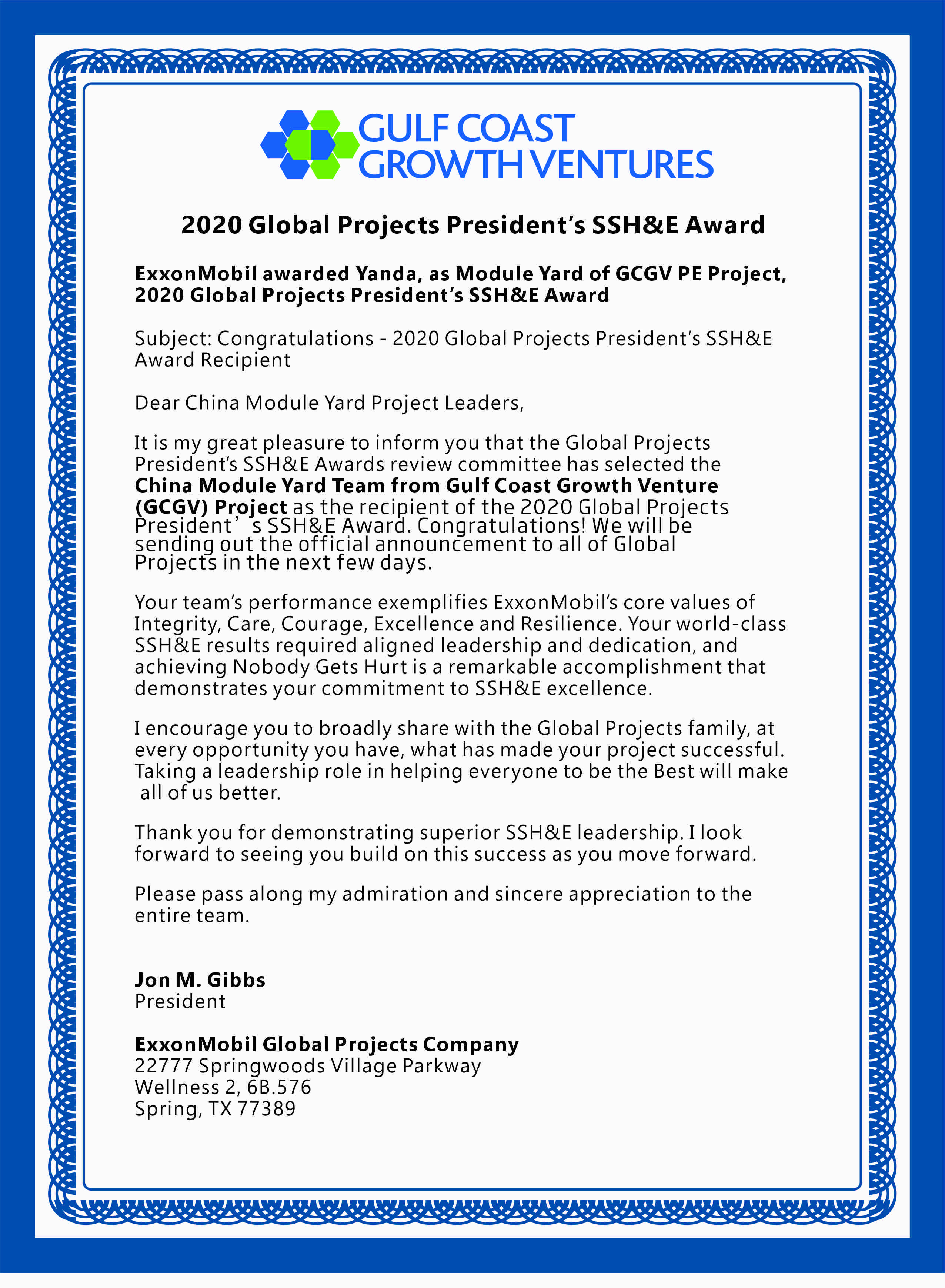近日,??松梨冢‥xxonMobil)全球項(xiàng)目總裁Jon M. Gibbs先生親自發(fā)來信函,祝賀燕達(dá)海門榮獲??松梨诳偛肧SH&E獎(jiǎng)。信函中,Jon M. Gibbs先生表示,燕達(dá)海門在GCGV PE項(xiàng)目中卓越的表現(xiàn)體現(xiàn)了??松梨谡\信、關(guān)懷、勇氣和韌性的核心價(jià)值觀。燕達(dá)海門的世界級(jí) SSH&E 表現(xiàn)體現(xiàn)了一致的領(lǐng)導(dǎo)力和奉獻(xiàn)精神,實(shí)現(xiàn)無傷害無事故是一項(xiàng)了不起的成就,表明了燕達(dá)海門對(duì) SSH&E 的承諾。